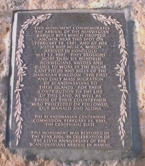 • Unfortunately the location of the monument did not work out well. It has been vandalize multiple times, so it did not make sense to replace it over and over again. A new informational plaque has been created and is in the process of being set up at the Alexander and Baldwin Sugar Museum in Pu’unene, Maui. The new plaque tells a bit more of the story of the Scandinavian immigration in 1881 as well as honoring the original Bautastein. It is wonderful to have the Scandinavians sugar history represented alongside the many other migrant groups that came to work in Hawaii’s sugar plantations.