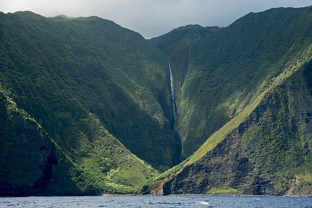 A view of the highest sea cliffs in the world, towering 3,600-3,900 feet in the air. They formed a natural barrier for the Kalaupapa colony of outcast lepers in the 19th century.  If you’d like to see more of these sea cliffs they are featured in the movie  Jurassic Park III.
